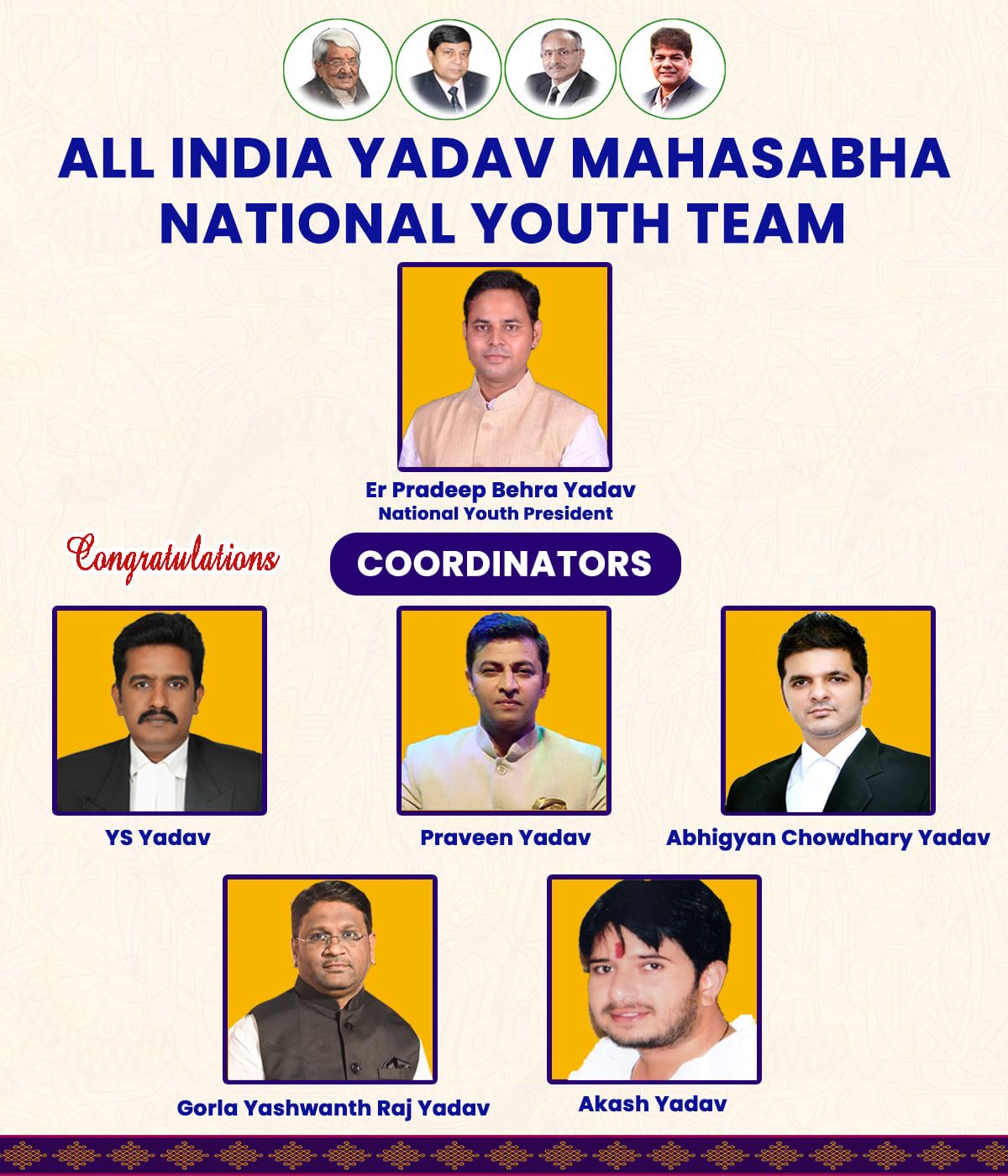 नई नियुक्तियों की घोषणा करते हुए राष्ट्रीय युवा अध्यक्ष प्रदीप बेहरा यादव ने कहा कि उन्होंने अखिल भारतीय यादव महासभा के अध्यक्ष उदय प्रताप सिंह, वरिष्ठ उपाध्यक्ष सत्यप्रकाश सिंह और महासचिव प्रमोद चौधरी की सहमति से ये न्युक्तियां की हैं। “अखिल भारतवर्षीय यादव महासभा” एक समुदाय आधारित राष्ट्रव्यापी सामाजिक संगठन है, जिसकी लगभग सभी भारतीय राज्यों में इकाइयाँ हैं।
